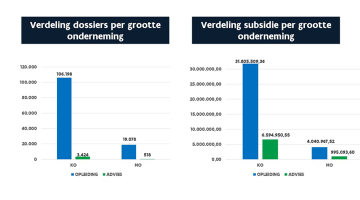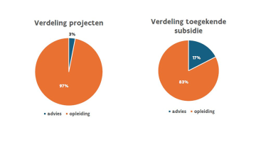 De kmo-portefeuille wordt vooral aangevraagd voor opleidingen, maar adviestrajecten zijn gemiddeld duurder per subsidieaanvraag. Hoewel advies slechts goed is voor 3% van de projecten, vertegenwoordigt het toch 17% van het totale subsidiebedrag – in totaal € 7,6 miljoen. Adviestrajecten vereisen dan ook gemiddeld meer middelen en zijn vaak complexer en intensiever.