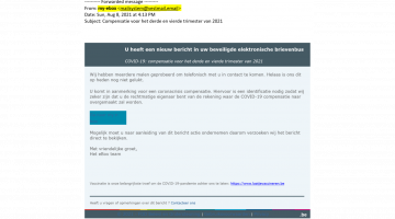 Momenteel gaan weer enkele nieuwe phishing e-mails rond die grafisch goed lijken op e-mails van de overheid, en die vaak zelfs doorlinken naar de echte website van de FOD Financiën of laatjevaccineren.be. Helaas hebben deze e-mails voorts helemaal niets met de Vlaamse of Belgische overheid te maken hebben! Dit kan je onmiddellijk afleiden uit het vreemde e-mailadres van de afzender: