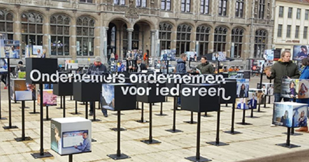 Onze installatie toont 90 portretten van ondernemers en hun zaak. In elke stad worden de lokale ondernemers extra in de kijker gezet. Je kan de installatie 24/24 bezoeken, zelfs als het donker is!