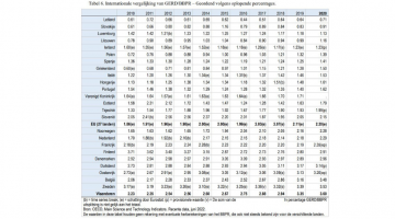 Onderstaande tabel geeft de percentages van GERD/bbpr weer voor verschillende Europese landen en regio’s, geordend volgens oplopende percentages. Een internationale vergelijking leert dat Vlaanderen met beide berekeningswijzen van de O&O-intensiteit aan de top van de EU-27 staat. Een dergelijke internationale vergelijking moet wel met de nodige voorzichtigheid gebeuren. Voor de meeste landen zijn er immers nog geen recente cijfers beschikbaar en zijn de hier gerapporteerde cijfers gebaseerd op (voorspellingen uit) de vroegere vragenlijsten. Als er al cijfers voor 2020 beschikbaar zijn, dan zijn deze bovendien vaak provisioneel of geschat.